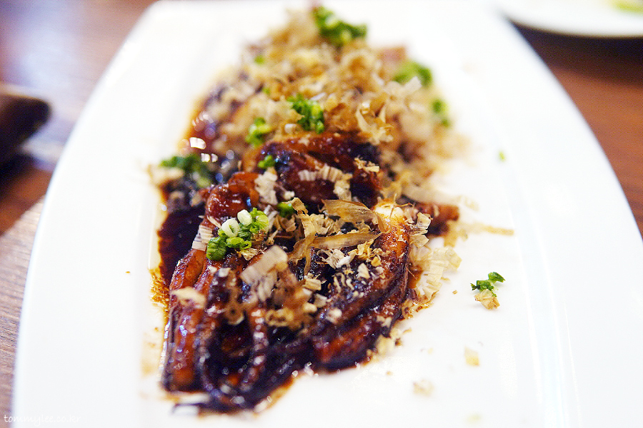 구이 메뉴가 조리시간이 많이 소요되긴 하네요.. 같이 주문한 메뉴들보다 확연히 늦게 도착.. 그냥 단순히 구워서 나오는 게 아니라 간장소스를 정말 제대로 발라서 구워낸 후 먹기 좋은 사이즈로 썰어서 제공.. 네기와 카츠오부시 토핑이 더해져 있었답니다..