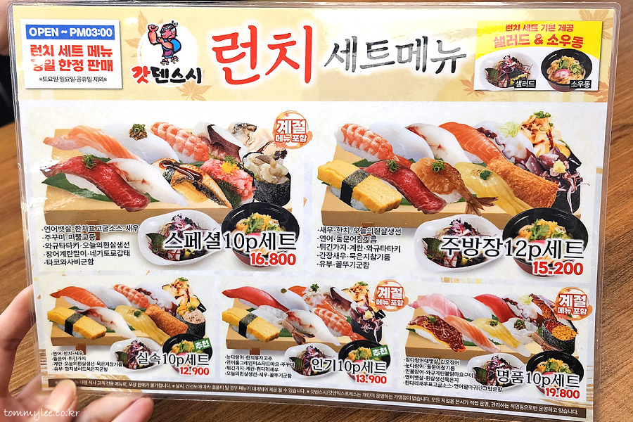 갓덴스시 평일한정 런치 세트 메뉴.. 샐러드&소우동 기본 제공.. 스페셜10P세트 16,800원, 주방장12P세트 15,200원, 실속10P세트 12,900원, 인기10P세트 13,900원, 명품10P세트 19,800원.. 런치 시간은 오픈~오후3시, 토,일,공휴일은 제외라고 합니다..