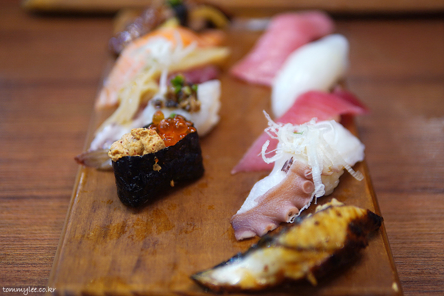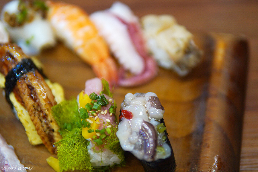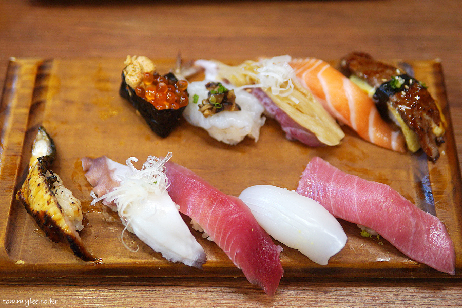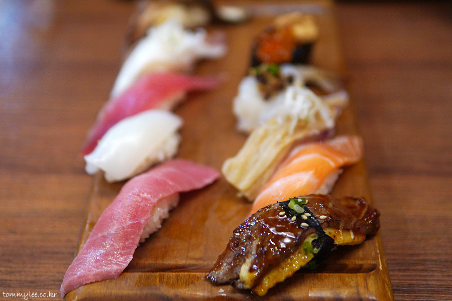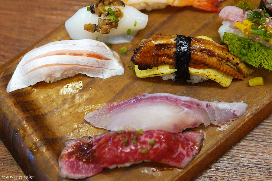 윗줄 왼쪽부터 연어알아귀간크림군함, 흰다리새우표고굴소스, 흰살생선묵은지, 연어뱃살, 와규계란불닭마요구이 / 민물장어, 돌문어참기름, 눈다랑어, 갑오징어, 참다랑어대뱃살.. 중뱃살 같은 대뱃살이긴 했지만 뭐 어쨌거나 가성비가 좋다는 지인분의 평가셨고요..