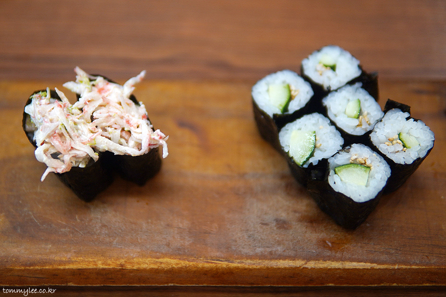 CUCUMBER MAKI.. 오이 마끼.. 1,500원.. IMITATION CRAB WITH SWEET SEAWEED GUNKAN.. 감태맛살군함.. 1,500원..