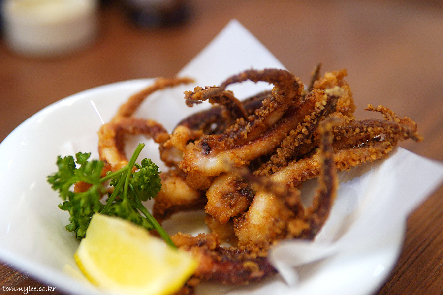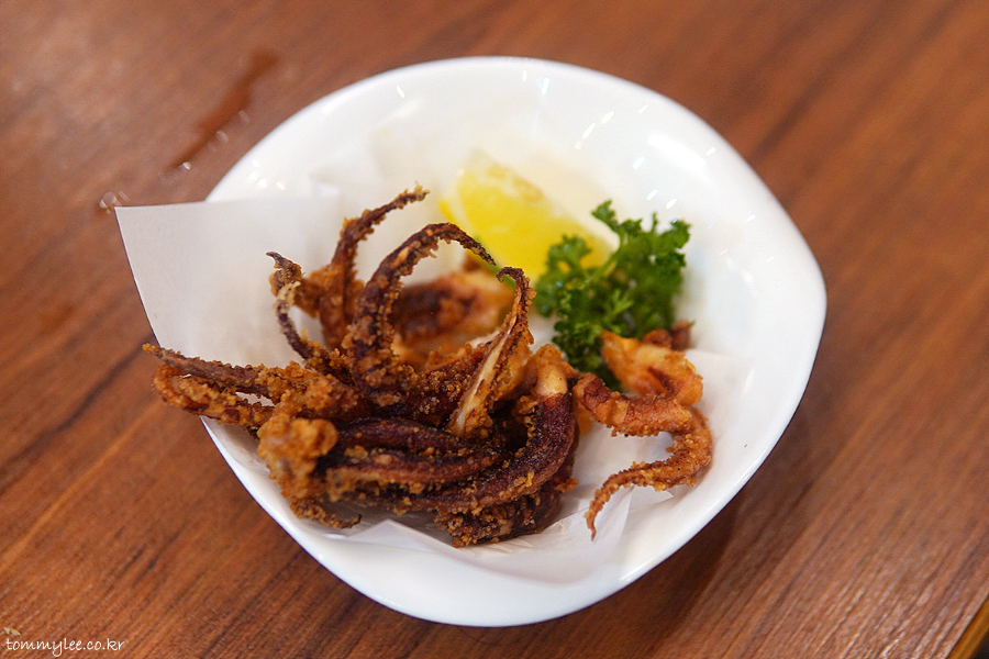 오징어 다리튀김이랑 오징어 통구이 중에서 무엇을 주문할까 고민하다가 둘 다 주문해 버렸습니다.. 먼저 도착한 건 이카게소 카라아게.. 오다리튀김..