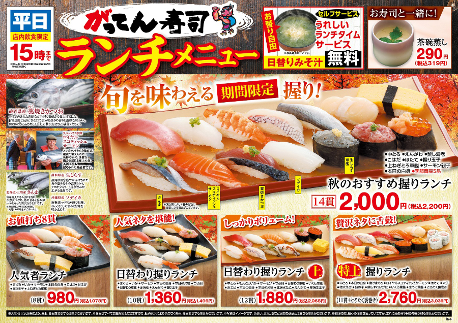 일본 갓덴즈시 런치 메뉴를 가져와봤습니다.. 일본도 한국이랑 비슷한 런치메뉴가 있는데요.. 네타 구성이나 가격은 차이가 있지만 가격도 그렇고 얼추 비스꾸리합니다.. 토쿠죠 니기리 같은 특상 메뉴가 없는 건 살짝 안타깝지만.. 평일한정이나 오후 3시까지인 점은 동일..