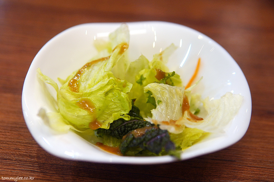 런치세트 주문 시 나오는 번들 샐러드입니다.. 하우스 샐러드로 보시면 될 것 같고요.. 한국 런치 한정의 특화 서비스입니다.. 평소에 판매하지 않는 이 샐러드를 서비스로 주는 것은 한국 초밥집들에서.. 판초밥 주문 시 샐러드랑 우동을 기본으로 서비스해 주기 때문입니다.. 경쟁업체를 의식한 서비스 너무 좋고요.. ㅋㅋㅋ..