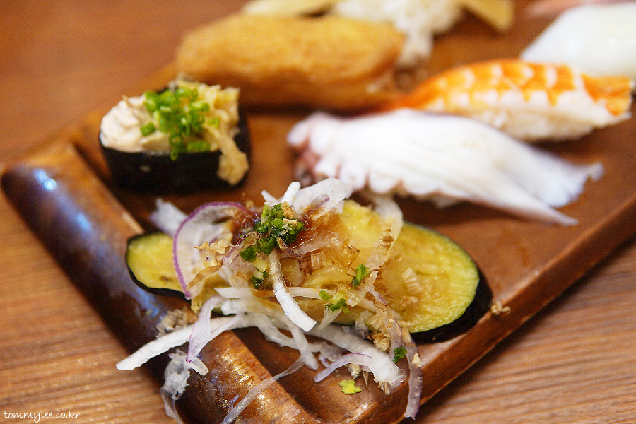 참치샐러드묵은지군함, 유부 / 튀긴가지, 돌문어입니다.. 갓덴스시에서 가장 대중적인 초밥들로 구성된 세트였답니다.. 정말 무난하고 또 무난한 구성인듯한 기분..
