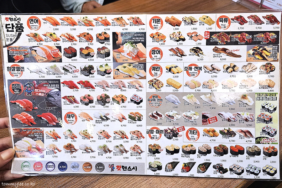 갓덴스시 초밥 단품 메뉴.. 가격은 녹색 1,500원 빨강 2,900원 보라 3,700원 남색 4,700원 은색 5,700원 금색 6,900원 체크 8,000원입니다..