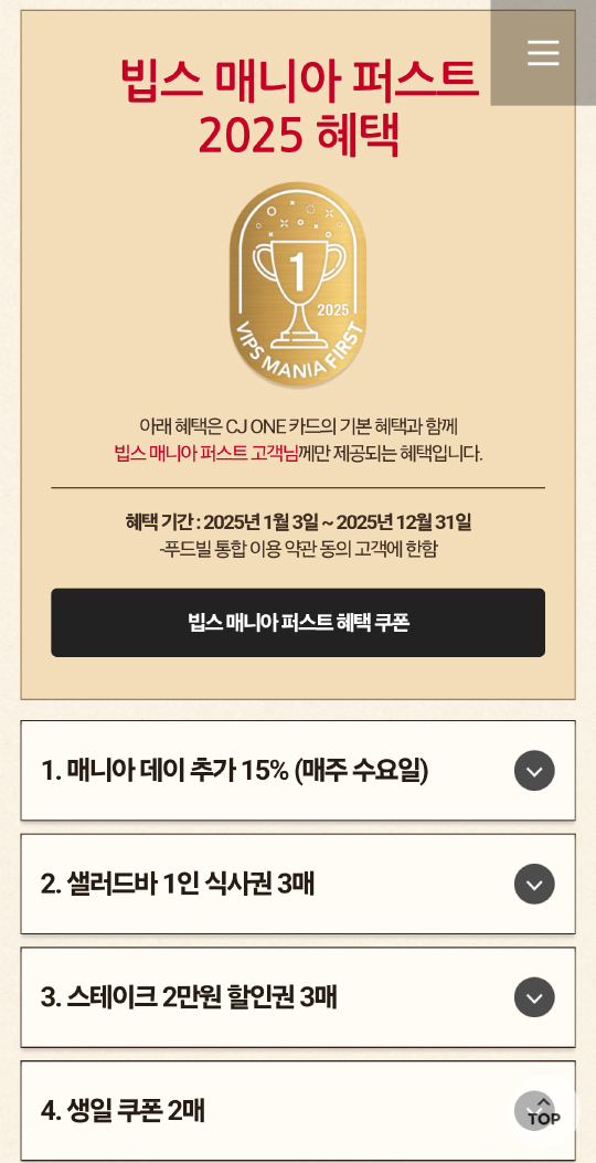빕스 매니아퍼스트 혜택은.. 매주 수요일 매니아데이 추가 15%할인, 샐러드바 1인 식사권 3매, 스테이크 2만원 할인권 3매, 생일쿠폰 엘본스테이크 & 케이크 교환권이 있답니다..