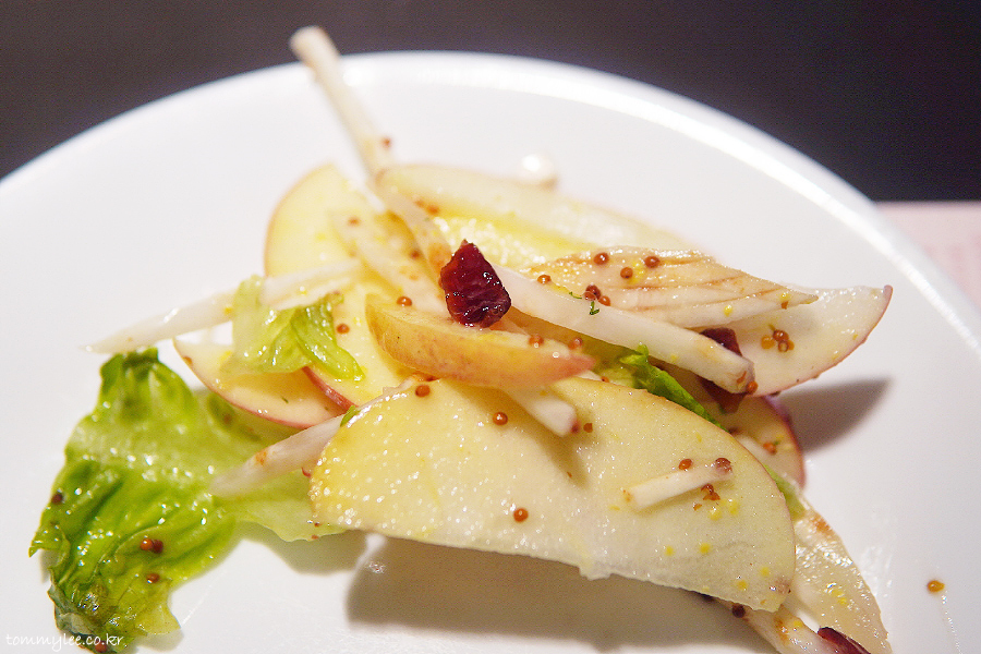 시즌 메뉴인 애플 샐러드.. 사과가 잔뜩 들어 있는 샐러드.. 청귤 드레싱이 맛남..