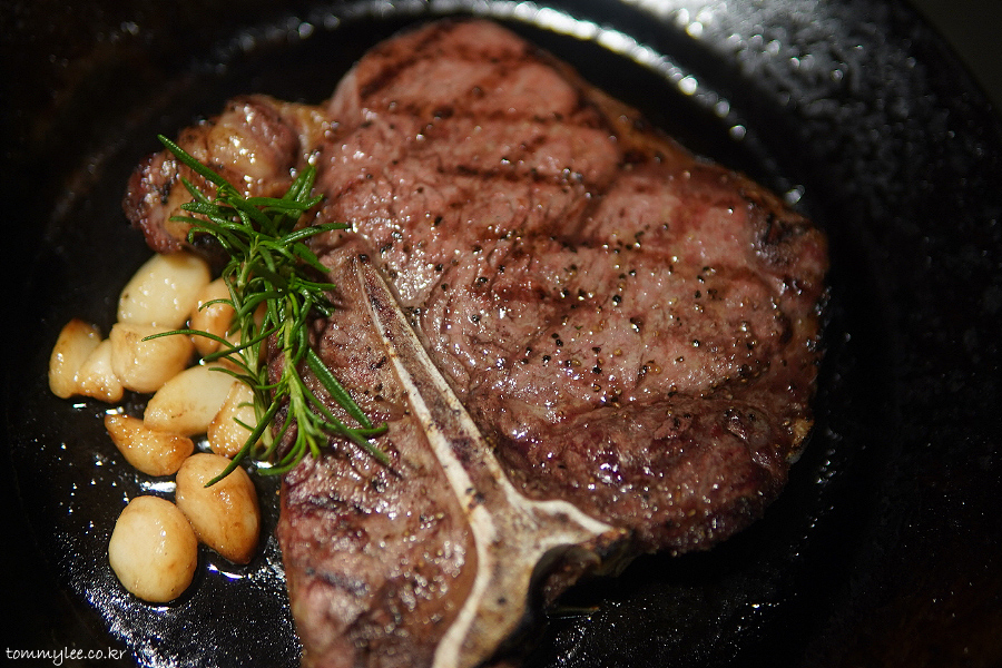 그리 중량감이 없는 6백그램대 사이즈라서 그런지 스테이크가 그리 두껍지 않은 상태였네요.. 통마늘과 로즈마리가 가니쉬로 함께 제공..