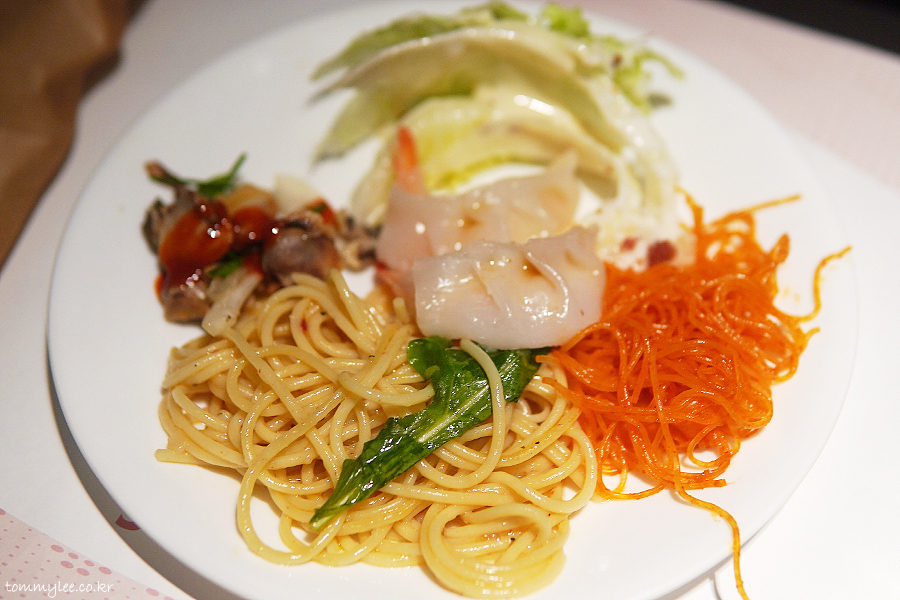 지인분의 첫 접시.. 바지락 알리오올리오, 핫타이 누들 샐러드, 슈림프 딤섬 등을 가져오신 모습이 되겠고요..