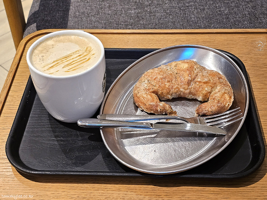 오랜만에 주문한 갈릭 크루아상입니다.. 스타벅스 크래프트 매장 크루아상 3종 중에서는 얘가 제일 별로라고 생각하지만 가끔은 그래도 먹어줘야 하는 메뉴..