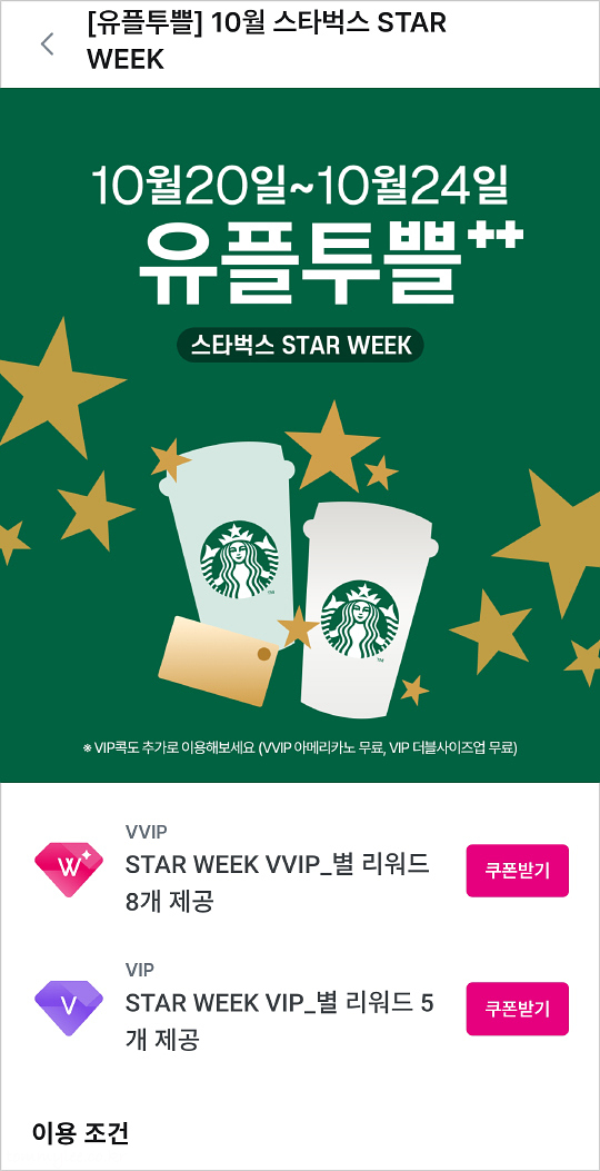 스타벅스가 최근 LG유플러스와 새롭게 제휴를 하면서 10월 유플투쁠에서 스타위크 이벤트를 진행했답니다.. STAR WEEK 행사 기간 동안 매일 VVIP 등급은 별 리워드 8개 제공, VIP 등급은 별 리워드 5개를 주는 전대미문의 훈훈한 별행사였답니다.. 유플러스 덕분에 별을 무려 40개나 챙길 수 있었고요.. ㅋㅋㅋ..