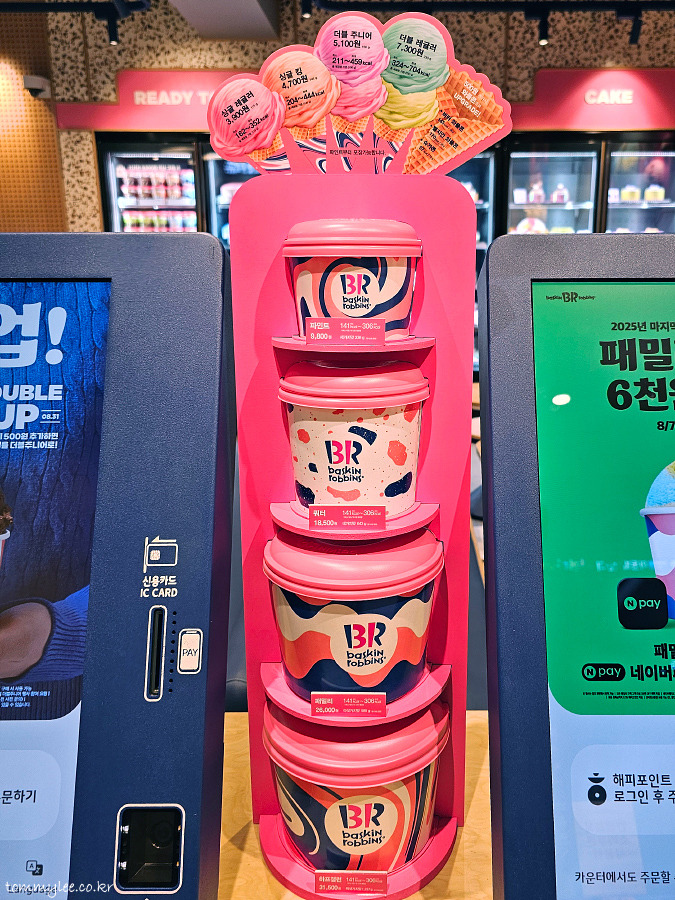 배스킨라빈스 아이스크림 사이즈 및 가격.. 싱글레귤러 3,900원, 싱글킹 4,700원, 더블주니어 5,100원, 더블레귤러 7,300원 / 파인트 9,800원, 쿼터 18,500원, 패밀리 26,000원, 하프갤런 31,500원..