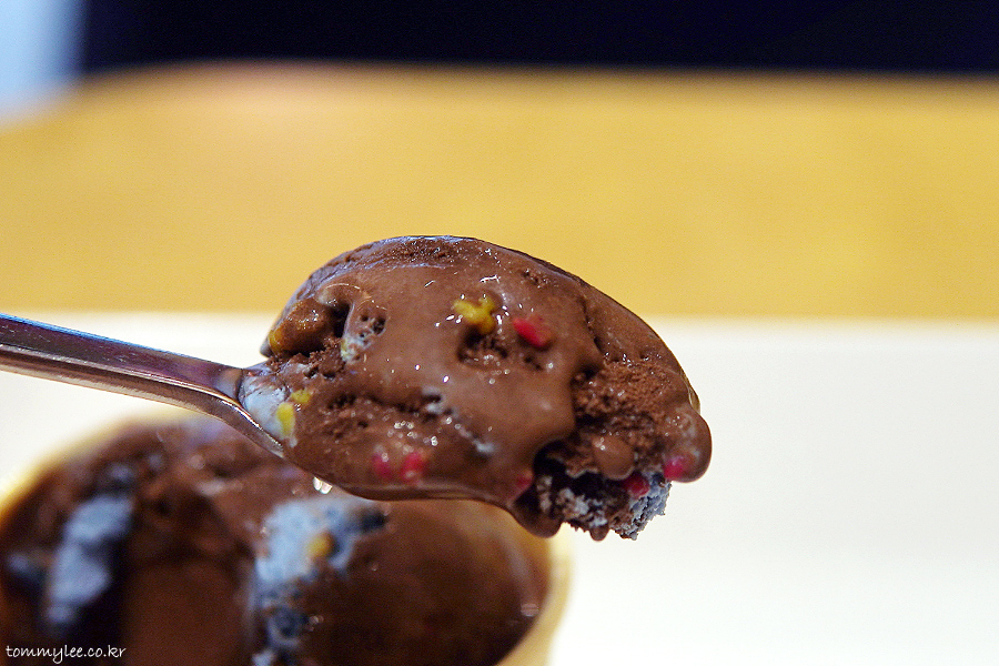 초콜릿 아이스크림, 민트 아이스크림에 빨강 노랑 톡톡이 팝핑캔디가 들어간 초코민트 아이스크림이 되겠습니다..
