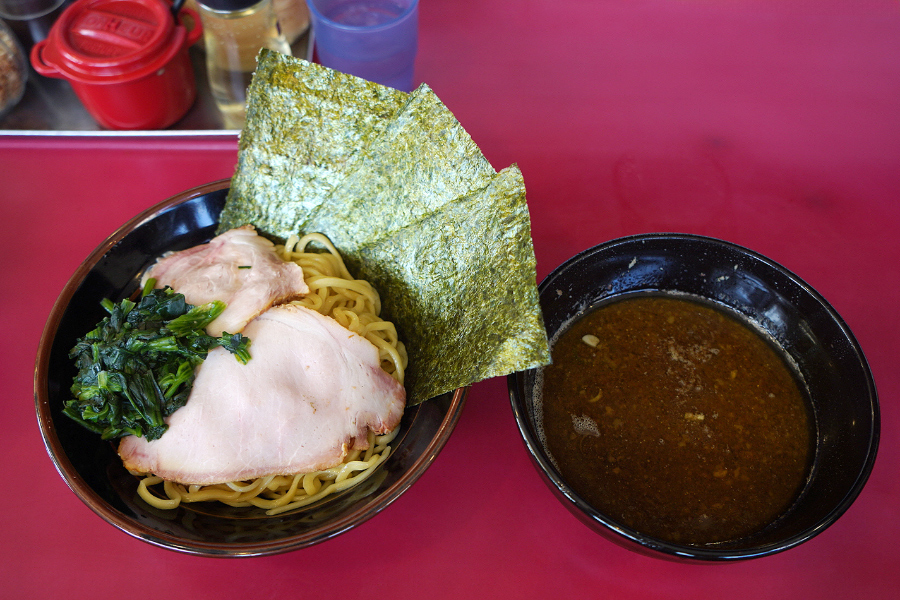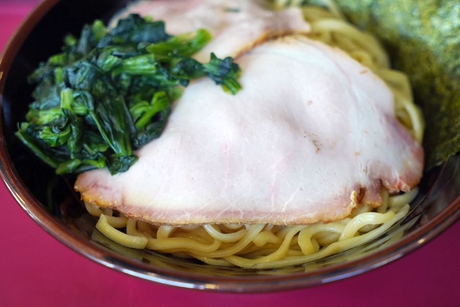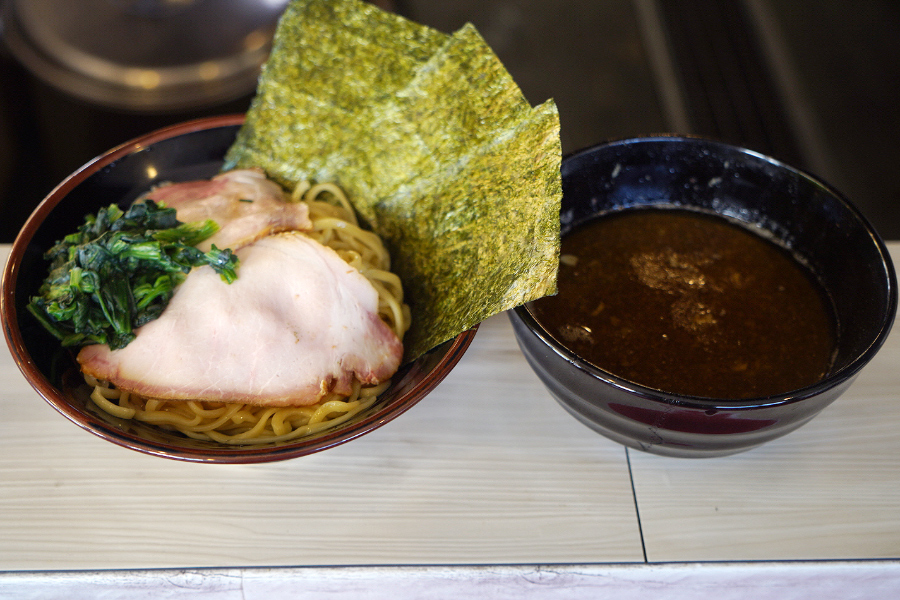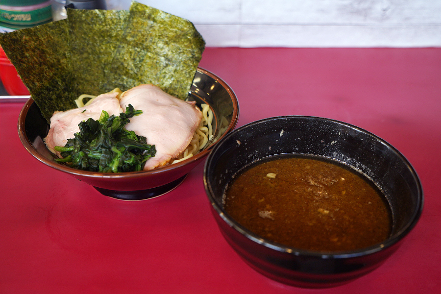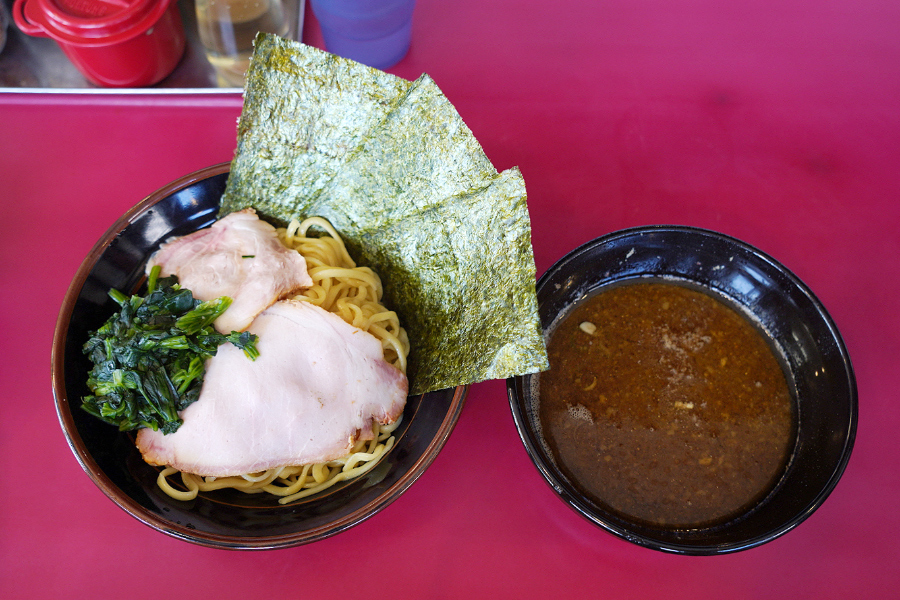 츠케멘 토핑은 기본 라멘과 같이 차슈 2장, 시금치, 김 2장의 구성.. 계란 토핑이 없는 줄 모르고 그냥 기본 츠케멘으로 주문했는데.. 비주얼을 위해서 80엔 내고 반숙계란 토핑 추가할 걸 그랬어요.. 지인분의 차슈멘도 시금치가 잔뜩 올라가 있었지만 츠케멘도 마찬가지로 시금치가 엄청 올라가 있네요.. 시금치 인심이 정말 훈훈합니다..