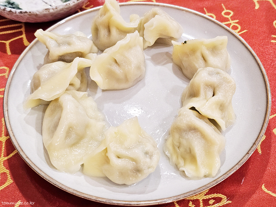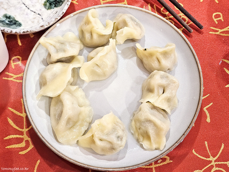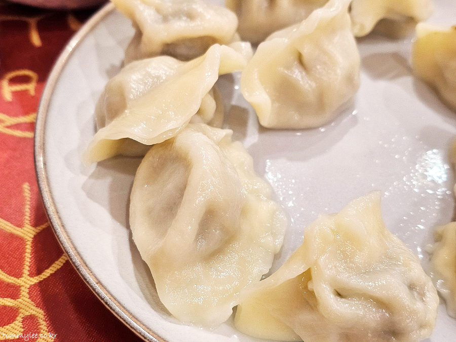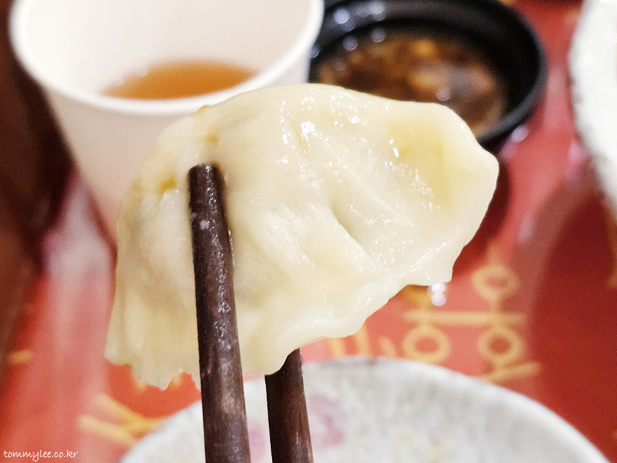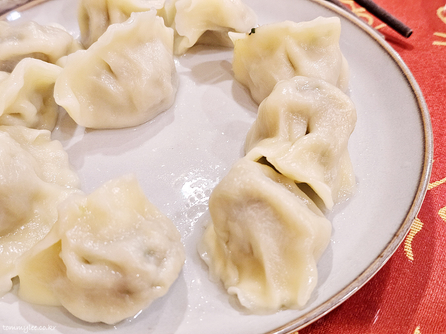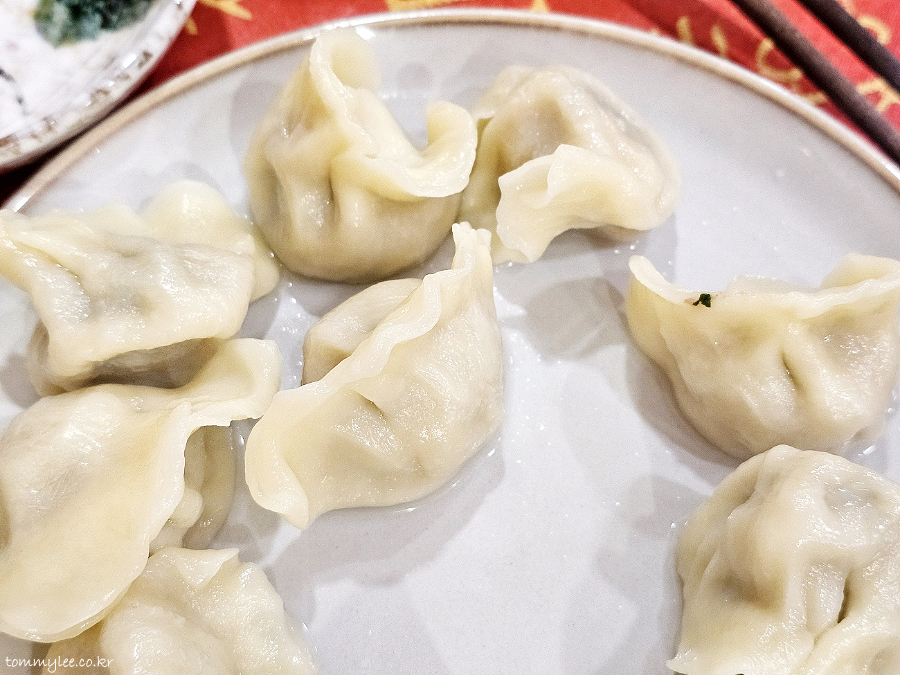도톰한 만두피의 물만두입니다.. 젓가락으로 잘 안 집힐 정도로 만두피가 글로시한 것이 특징입니다..