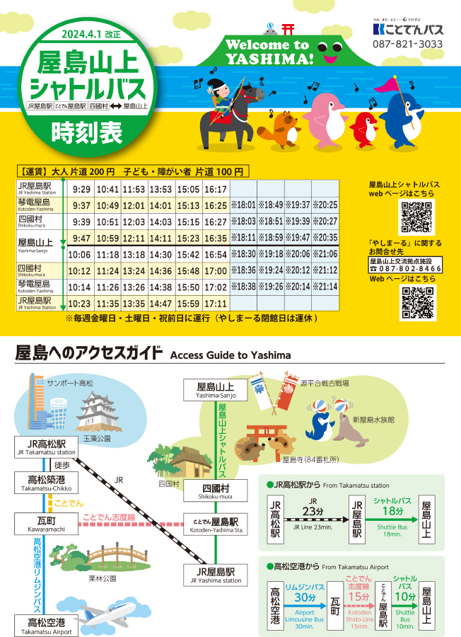 셔틀버스 시간표가 워낙에 중요해서 특별히 이미지로 올려드립니다.. JR야시마역을 기점으로 운행하는 버스이지만 코토덴에서 운영하는 게 재미있네요.. 암튼 시간표는 뭐 요러하고요.. JR야시마역에서 야시마산상까지는 18분 정도 소요, 코토덴 야시마역에선 10분 소요된다고 합니다.. 야시마전망대-야시마수족관-시코쿠무라 코스인데요.. 시간 부족으로 시코쿠무라까진 욕심인 듯..