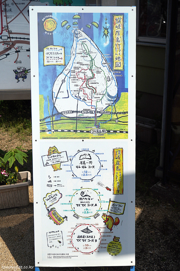 야시마는 야시마일주 린린코스와 세토내해 테쿠테쿠 코스로 돌아보면 좋다고 합니다.. 일러스트 귀엽네요..