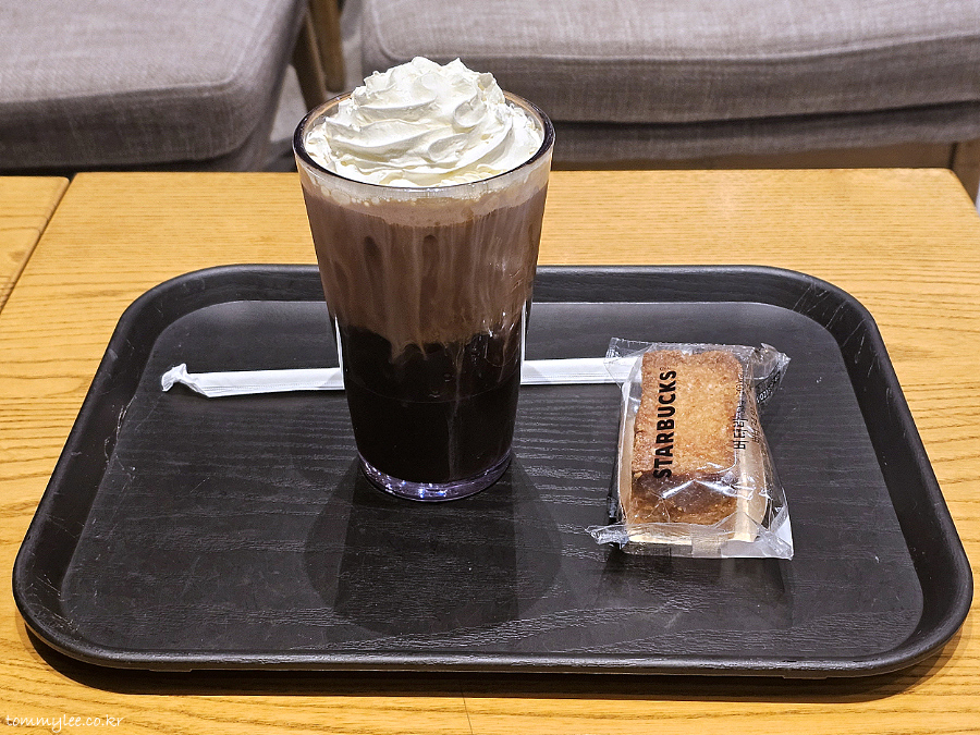 스타벅스 아메리카노에 휘핑크림을 올려 아인슈페너 스타일로 어렌지했고요.. 버터바를 추가해 봤네요..