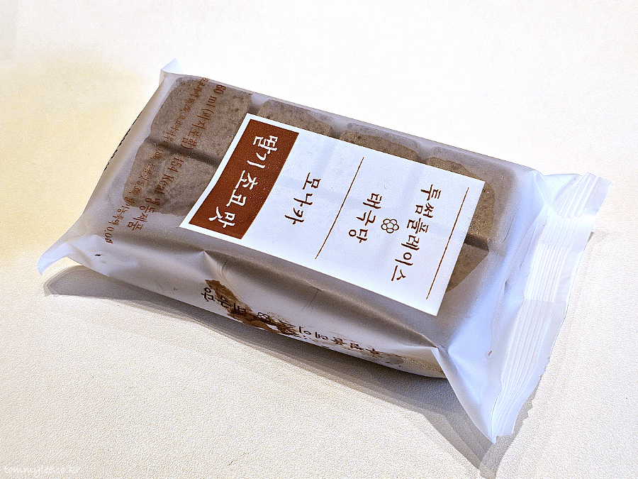 모나카 부분은 초콜릿이 아닌 차콜색이고요.. 모나카 안쪽에 딸기 초코 아이스크림이 들어가 있답니다..