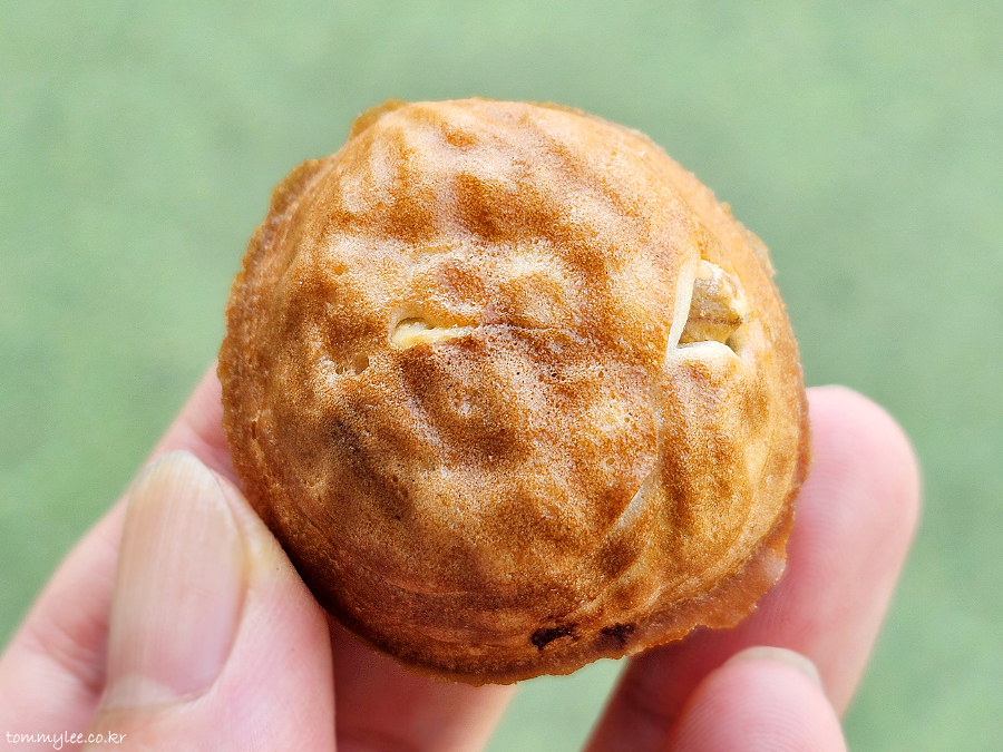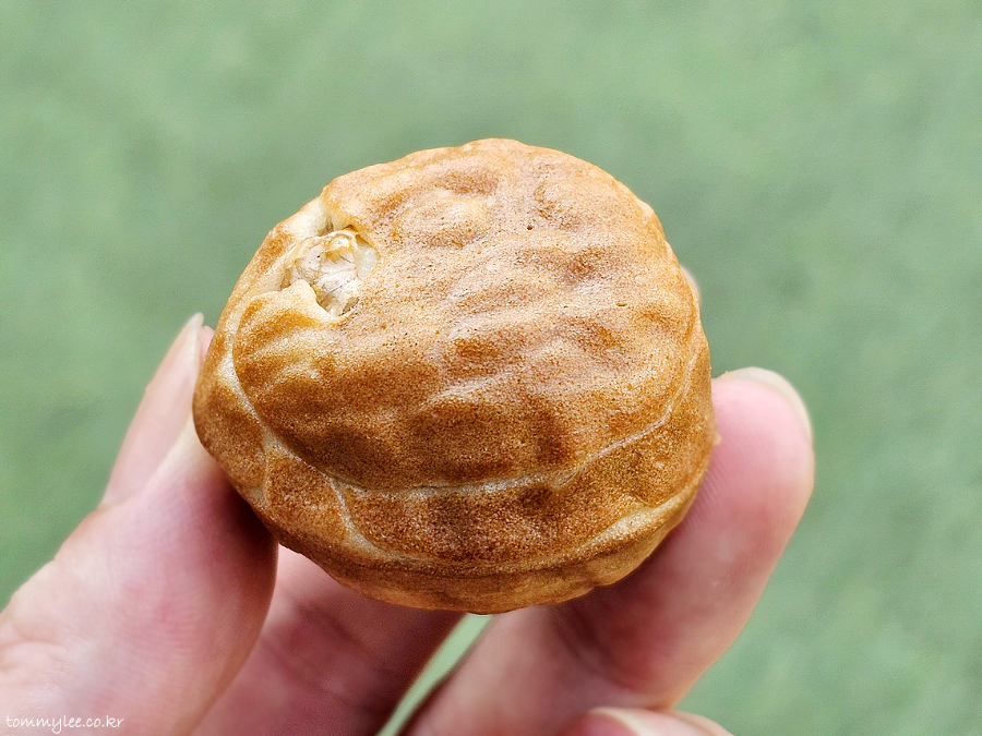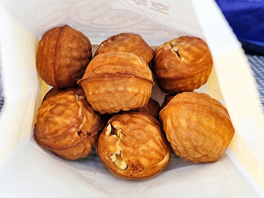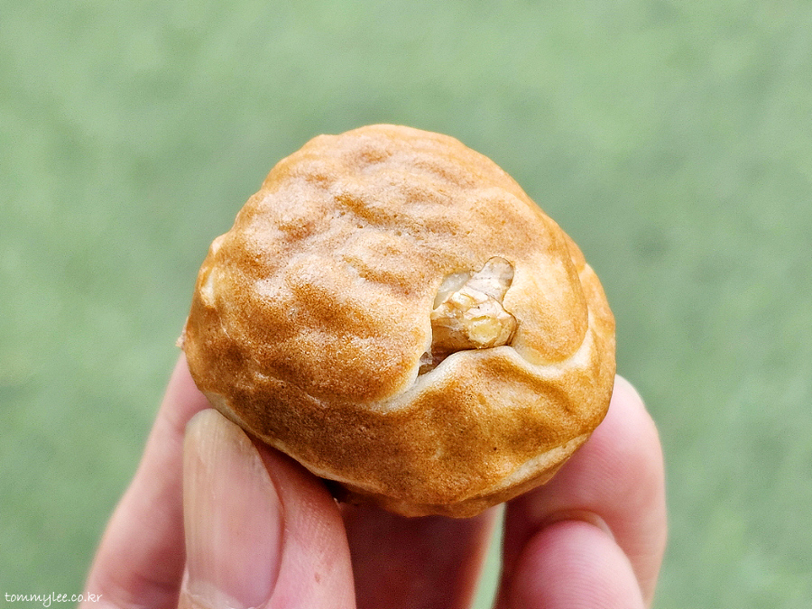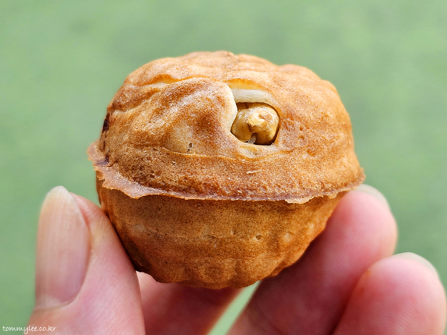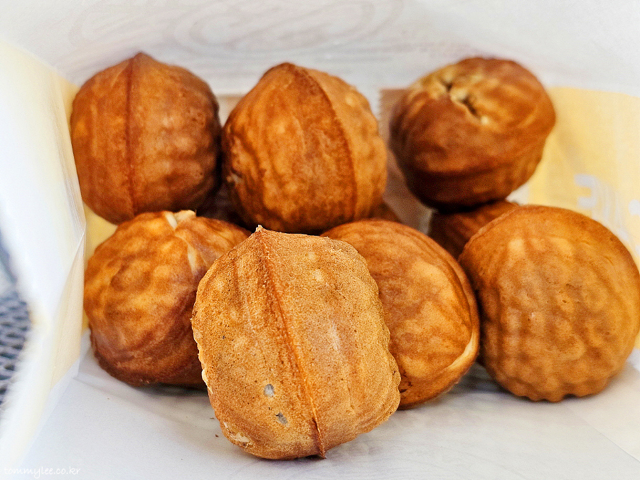 카라멜색으로 예쁘장하게 잘 구워져 나온 모습.. 과자 안에 들어간 호두가 눈에 보이는 이 호두과자의 비주얼 사랑스럽네요..