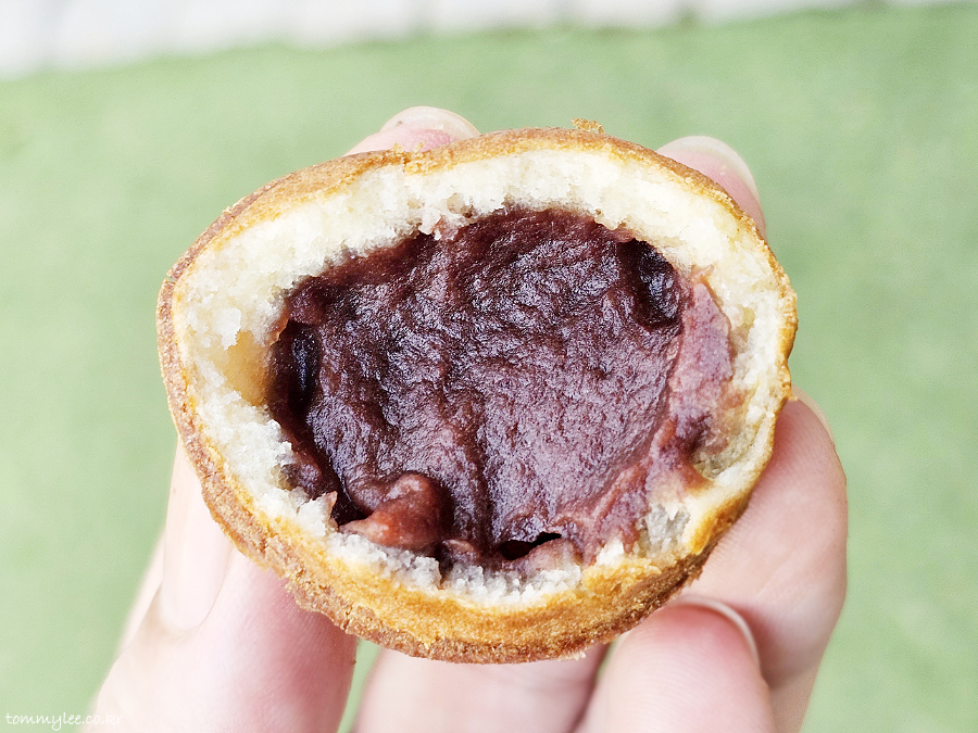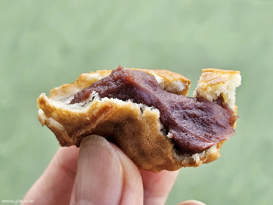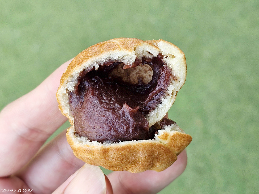 호두과자 안쪽은 뭐 요런 느낌이에요.. 적앙금이 꽉 채워져 있는데요.. 앙금이 많이 뜨거우니 주의하셔야 합니다.. 반을 갈라 식히면서 드시는 걸 추천..