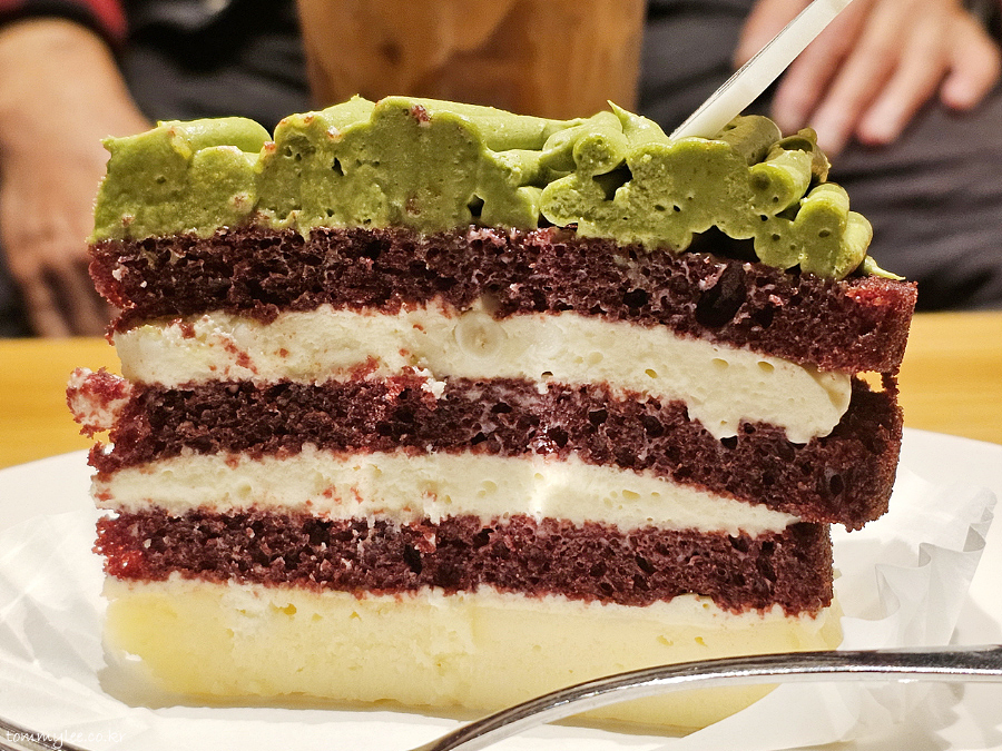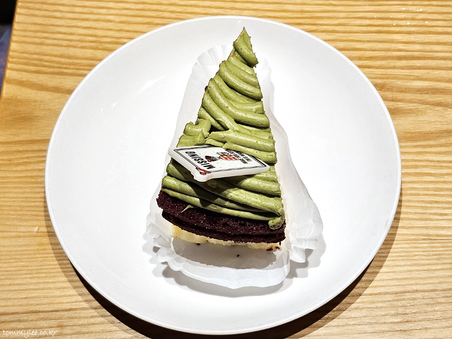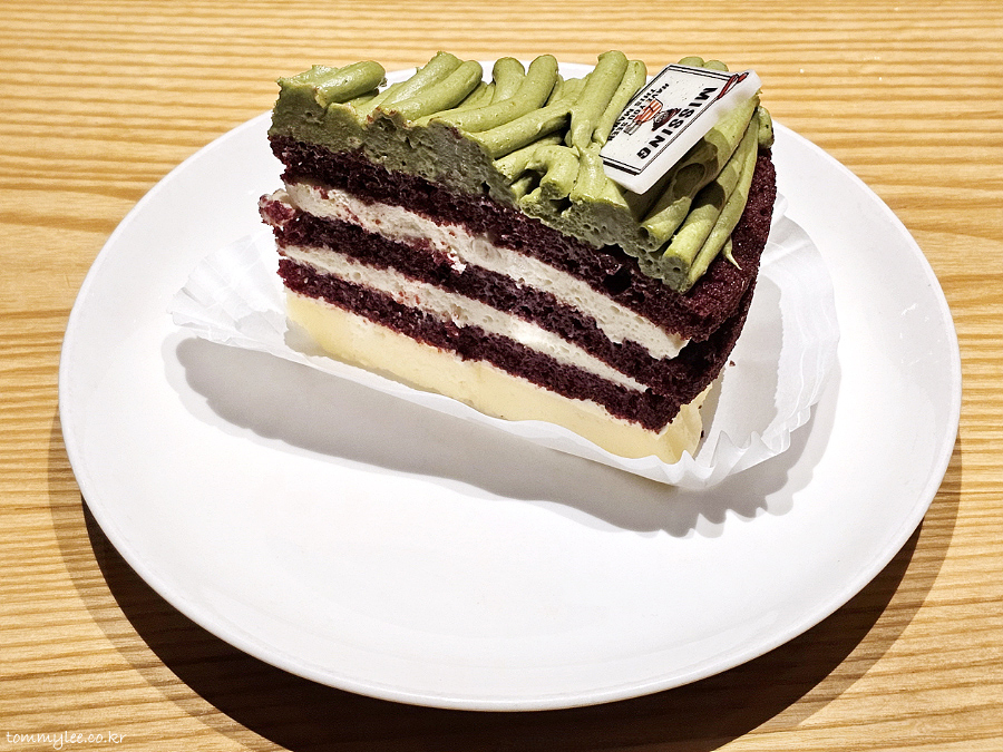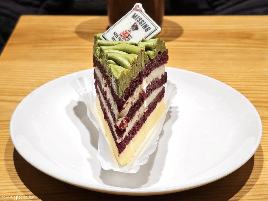 치즈케이크 바텀에 레드벨벳 케이크 그리고 말차 크림의 훈훈한 조합 은근 매력적..