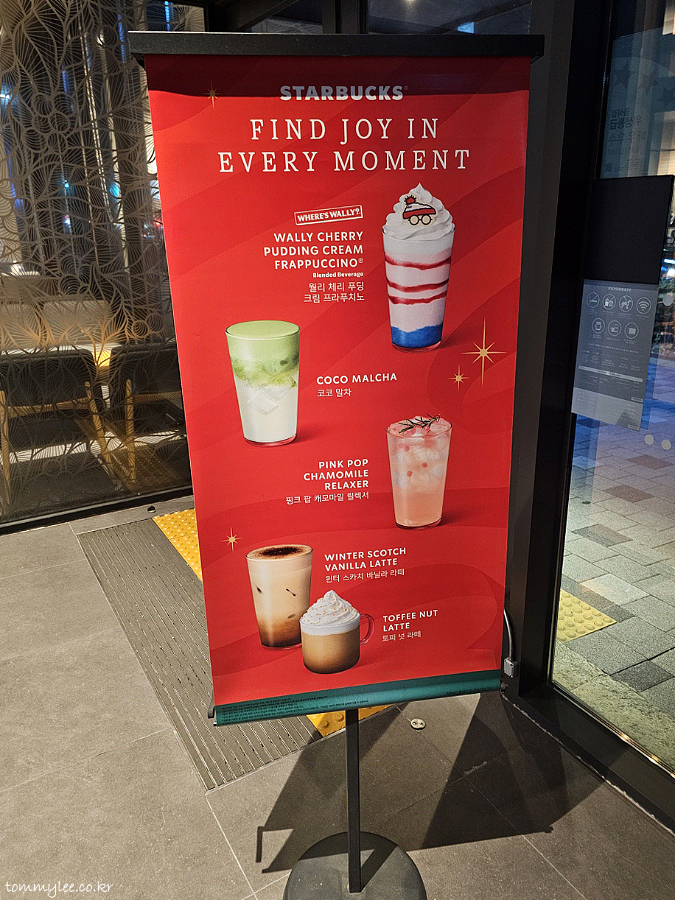FIND JOY IN EVERY MOMENT.. 월리체리푸딩크림프라푸치노, 코코말차, 핑크팝캐모마일릴렉서, 윈터스카치바닐라라떼, 토피넛라떼 5종 프로모션 중..
