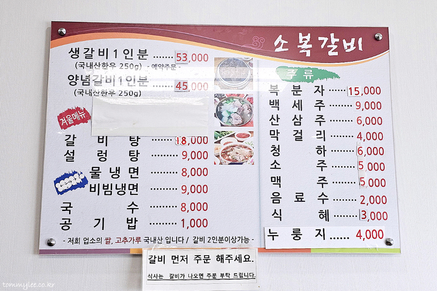 소복갈비 주요 메뉴 및 가격.. 생갈비 53,000원, 양념갈비 45,000원, 갈비탕 18,000원, 설렁탕 9,000원, 굴회 34,000원.. 지난 방문 때와의 가격변동은 없네요..