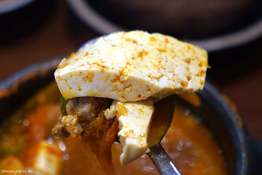두툼한 뚝배기에 제대로 뜨겁게 제공된 돼지 김치찌개의 모습입니다.. 두부랑 돼지고기가 꽤 충실하게 들어 있어요..