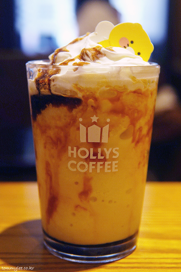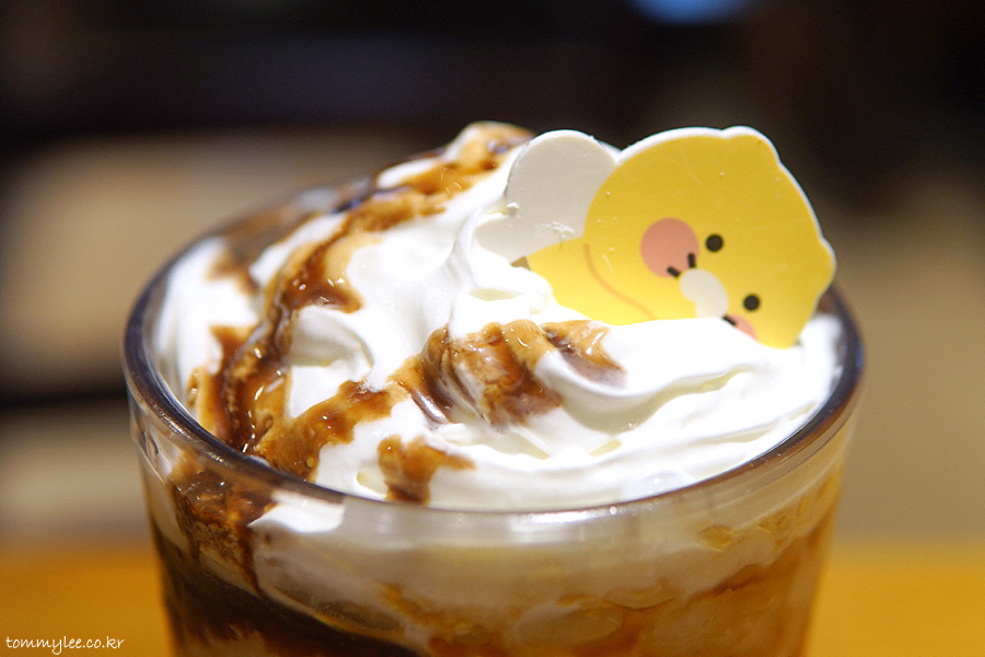 휘핑크림에 흑당 드리즐과 춘식이 화이트초콜릿으로 장식이 되어 있는 모습입니다.. 흑당과 카라멜을 같이 넣어서 진짜 달달함이 하늘을 찔러요.. 할리치노 중에서도 탑급의 달달함..