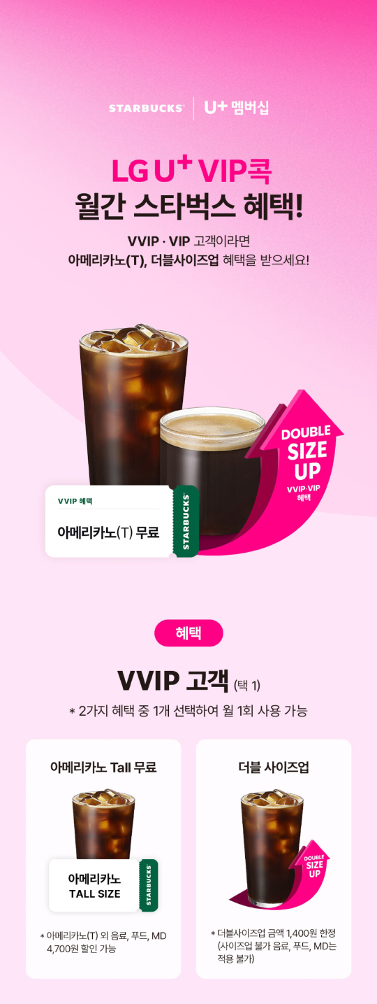 LG U+ VIP콕 월간 스타벅스 혜택.. VVIP VIP 고객이라면 아메리카노, 더블사이즈업 혜택을 받으세요.. 유플러스는 아메리카노 톨 사이즈에 해당되는 4,700원 할인입니다.. 음료는 물론이고 푸드와 MD에도 사용할 수 있는 금액권 느낌이랄까..