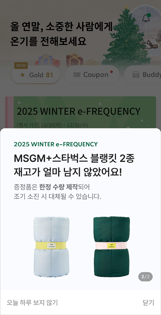 2025 WINTER E-FREQUENCY MSGM+스타벅스 블랭킷 2종 재고가 얼마 남지 않았다는 팝업 안내가 친절하게 떠줬어요.. 스타벅스의 이런 안내문은 허풍(--)이 아닌 진짜입니다.. 다음 날엔 못 받을 수도 있어요.. ㅡㅡㅋ..