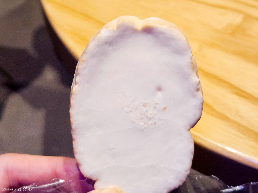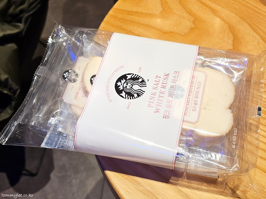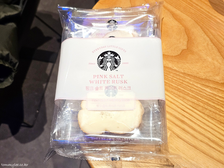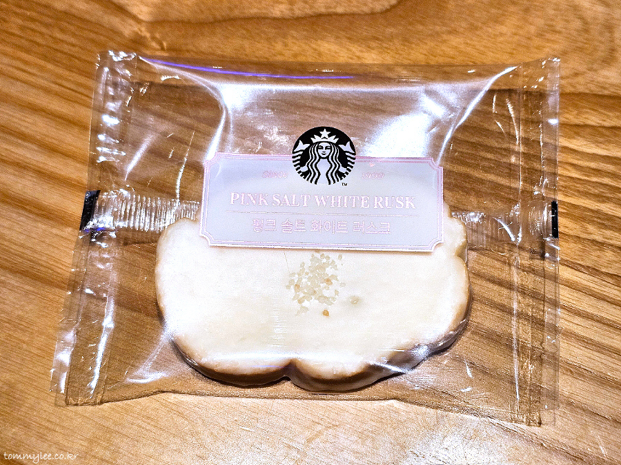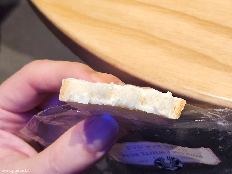 뭐 가격보단 맛이 더 중요한 게 아니겠냐며.. 바로 뜯어서 시식 진행.. 생각보다 러스크가 많이 얇은 기분.. 화이트 초콜릿 러스크 중앙에 보란 듯이 핑크 솔트가 자리하고 있었답니다.. 일반 러스크는 최근에도 지인분께서 사다 주셔서 맛봤지만 화이트 초콜릿 러스크는 기간한정으로 더운 계절엔 판매가 안되는지라 꽤 오랜만에 먹어 봅니다..