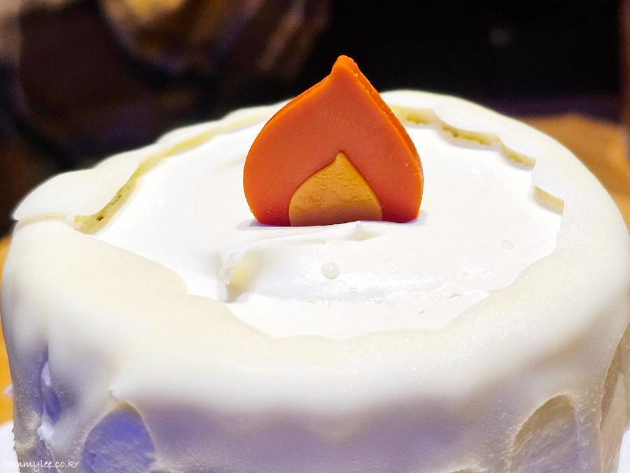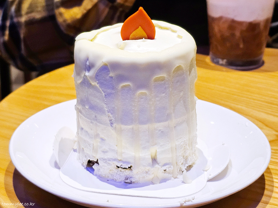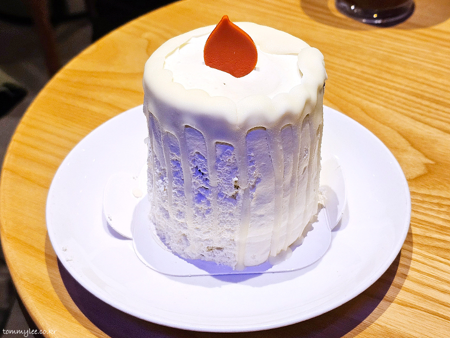 뚱뚱한 양초 모양의 케이크로 보시면 될 것 같고요.. 촛농 흘러내리는 느낌을 화이트 초콜릿으로 표현하고 있습니다.. 이 케이크는 이미지컷이랑 거의 비슷해요..