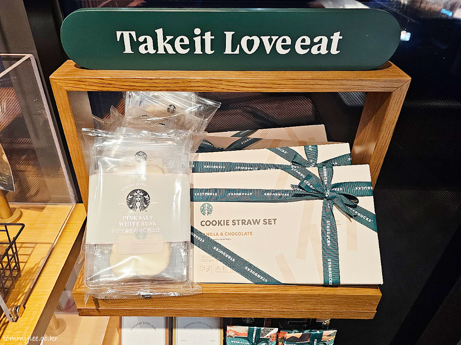 푸드 매대에 러스크가 없어서 대체 어디 있냐고 여쭈니 선물용 푸드는 따로 디스플레이를 한다고 합니다.. TAKE IT LOVE IT이라고 쓰여있는 이곳에 러스크랑 쿠키가 자리하고 있었어요.. 러스크 3봉 사면 2봉 가격으로 알아서 계산해 줍니다..