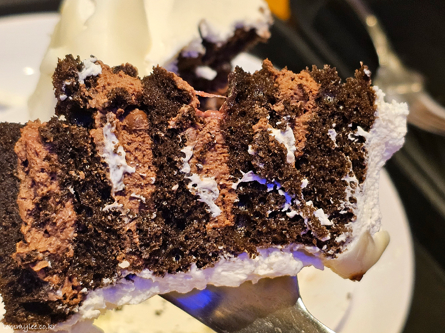 블랙벨벳 케이크 시트에 다크 가나슈 크림이 층층이 쌓여 있는 초콜릿 케이크인데요.. 케이크 시트가 4장이 들어가서 이렇게 높아요..