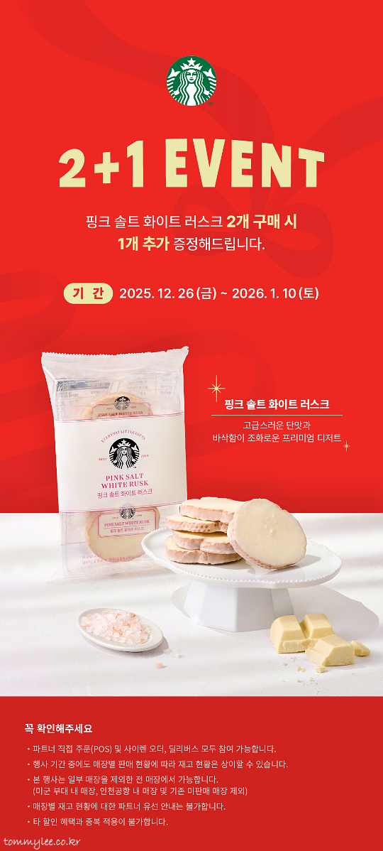 이번에 앱으로 프리퀀시 완성하면서 알게 된 프로모션인데요.. 핑크 솔트 화이트 러스크 2개 구매 시 1개를 추가 증정하는 러스크 2+1 행사가 있더라고요.. 개별 판매를 안 해서 맛보지 못한 핑크솔트 화이트 러스크를 먹을 수 있는 좋은 기회였답니다..