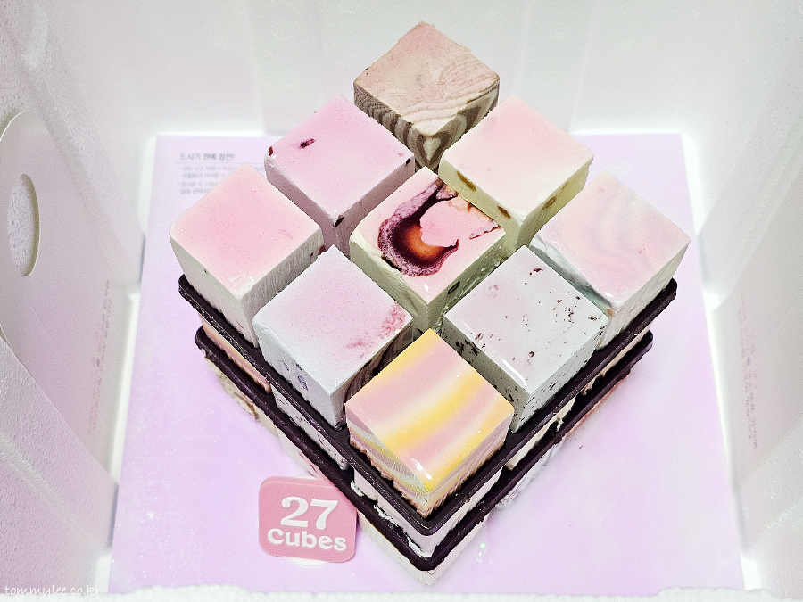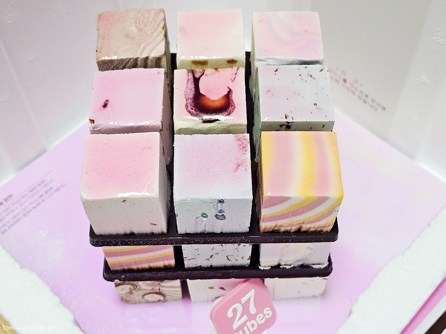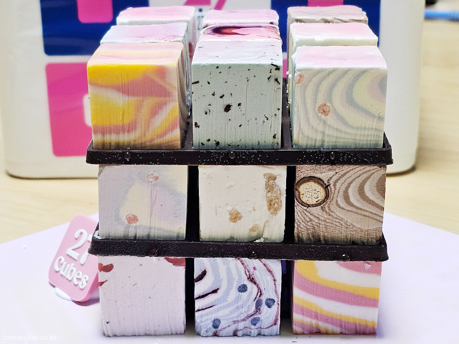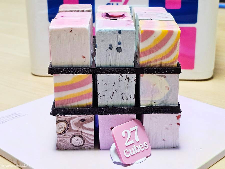 표면은 글로시하게 마감이 되어 있었답니다.. 27가지 플레이버가 있는 게 아니라 큐브 플레이버 구성은 총 9종으로 9가지 맛이 3개씩 들어가 있는 케이크라고 보시면 될 것 같습니다.. 양적으로 그렇게 많진 않아서 한번에 다 먹고 끝내기에 딱 좋은 사이즈였어요.. 실제로 한방에 다 먹어치움..