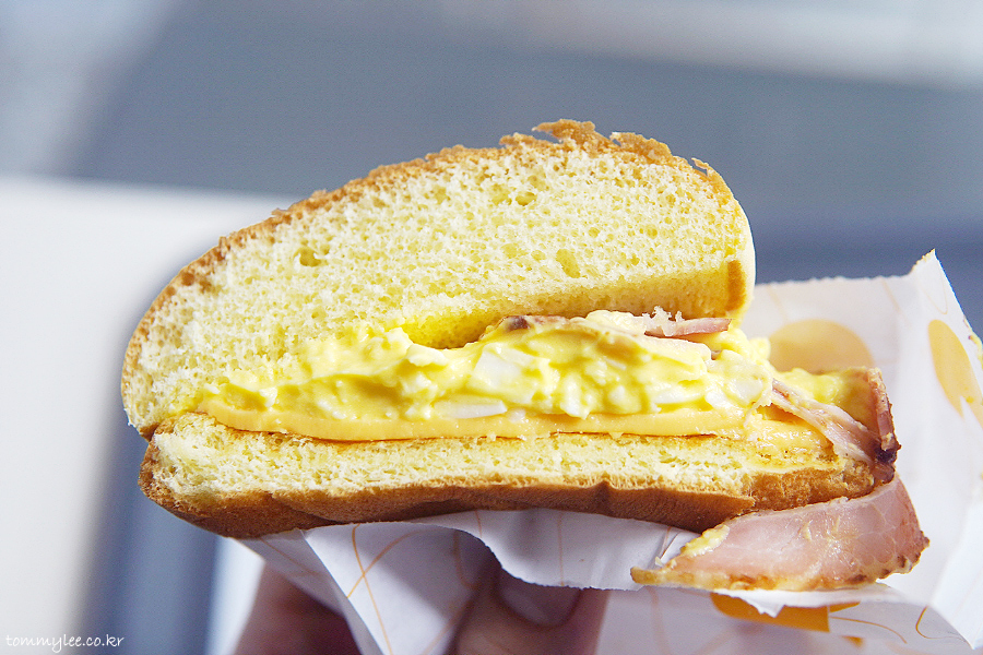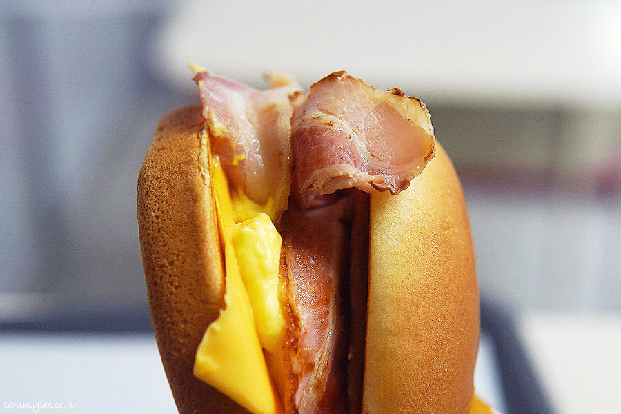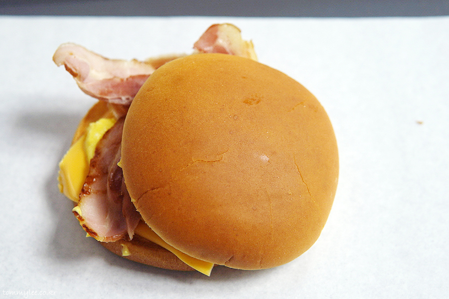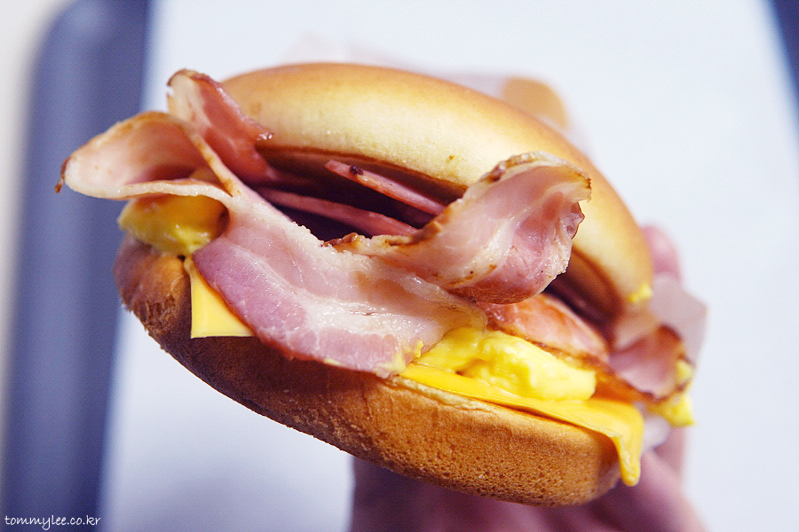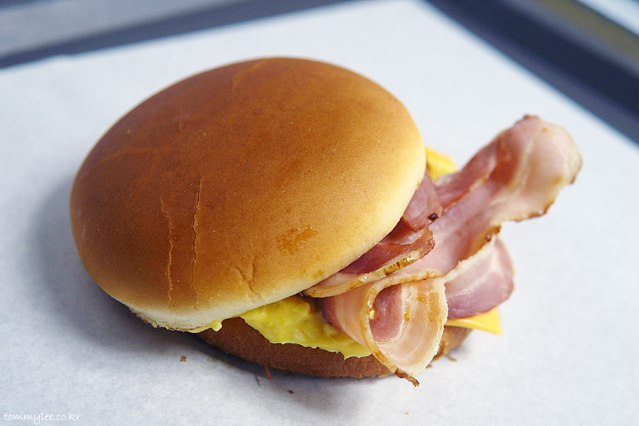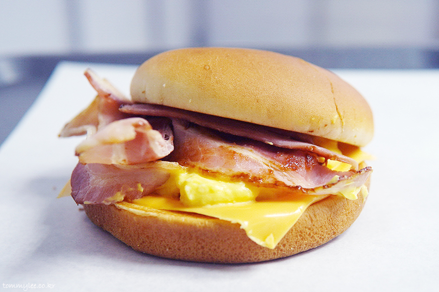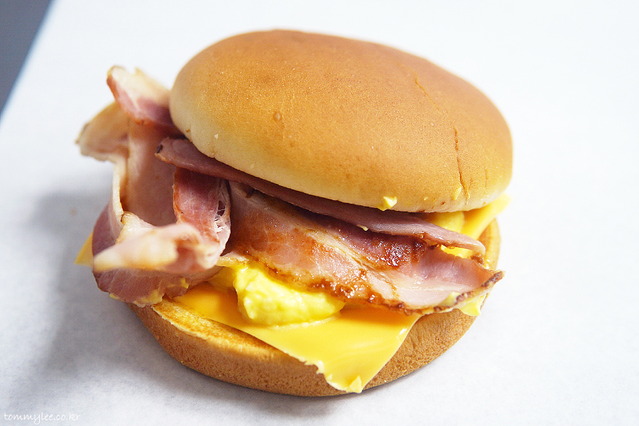 베이컨 에그번 구성은.. 버터번-슬라이스햄-베이컨-에그마요-아메리칸치즈-번의 순서..