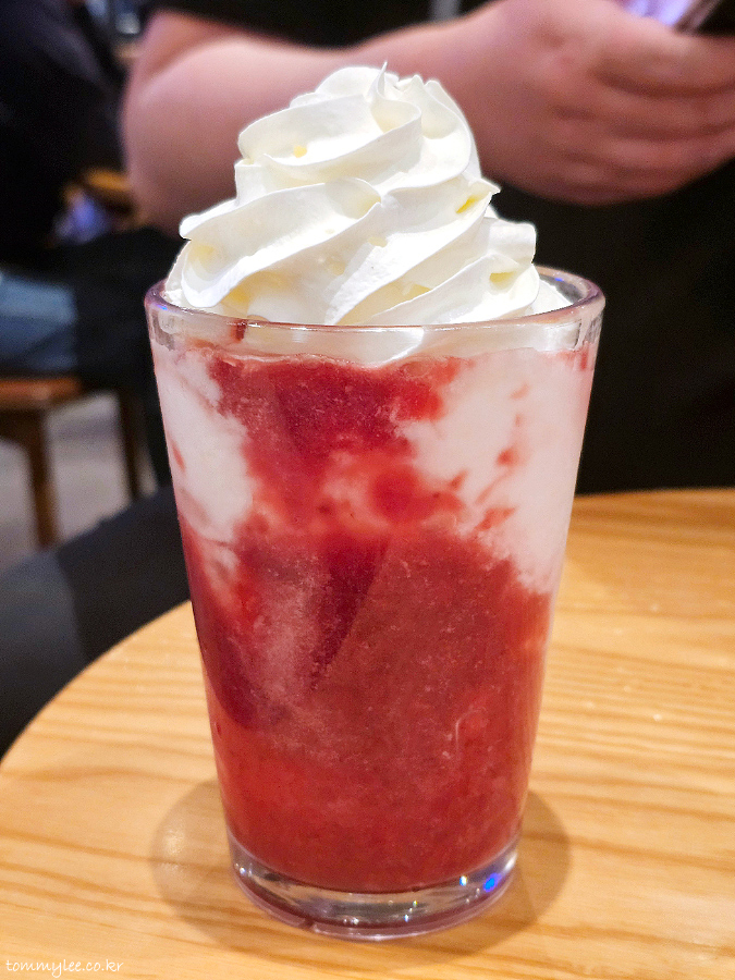 딸기 요거트를 마시는 느낌이라고 보시면 될 것 같다는.. 휘핑크림 올려서 드시는 걸 추천하고.. 무료 음료 쿠폰으로 주문하면 좋은 메뉴라는 거..