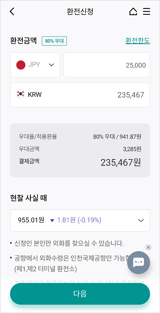 출국 전 날 밤에 하나은행 원큐 모바일 앱으로 환전을 하게 되었는데요.. 하나은행은 최대 90% 우대 환전을 하고 있는데, 영업시간 외에는 최대 80%까지만 우대가 된답니다.. 이건 경쟁 은행도 마찬가지였어요..