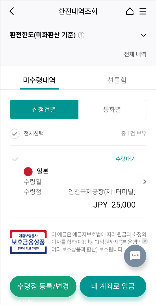 모바일 환전은 엄청 쉬워요.. 그냥 통장에 돈이 충분히 들어 있으면 끝입니다.. 수령대기로 일본 JYP 25,000엔이 뜬 거 확인하고.. 인천국제공항 제1터미널인 것까지 최종 확인 완료.. 이제 공항 가서 돈을 찾으면 되는..