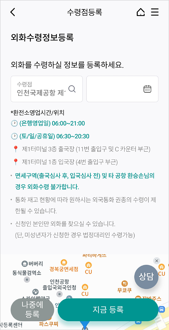 외화 수령정보 등록에서.. 수령점 인천국제공항 제1터미널인 거 확인하고 수령 날짜가 맞는 지 확인해준 후에.. 환전소 영업시간과 위치도 확인해 줍니다.. 평일 06시 오픈, 주말 공휴일 06시30분 오픈이네요..