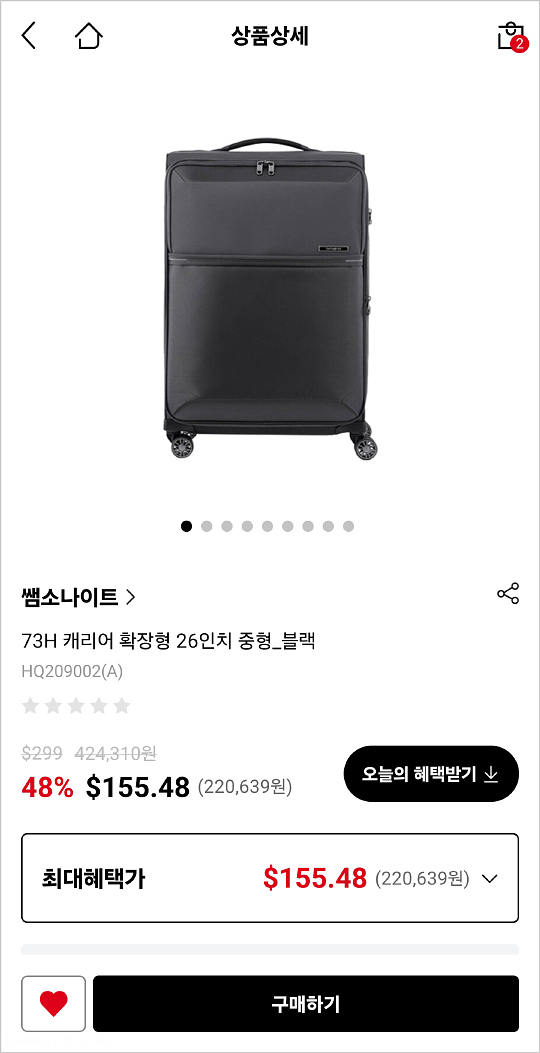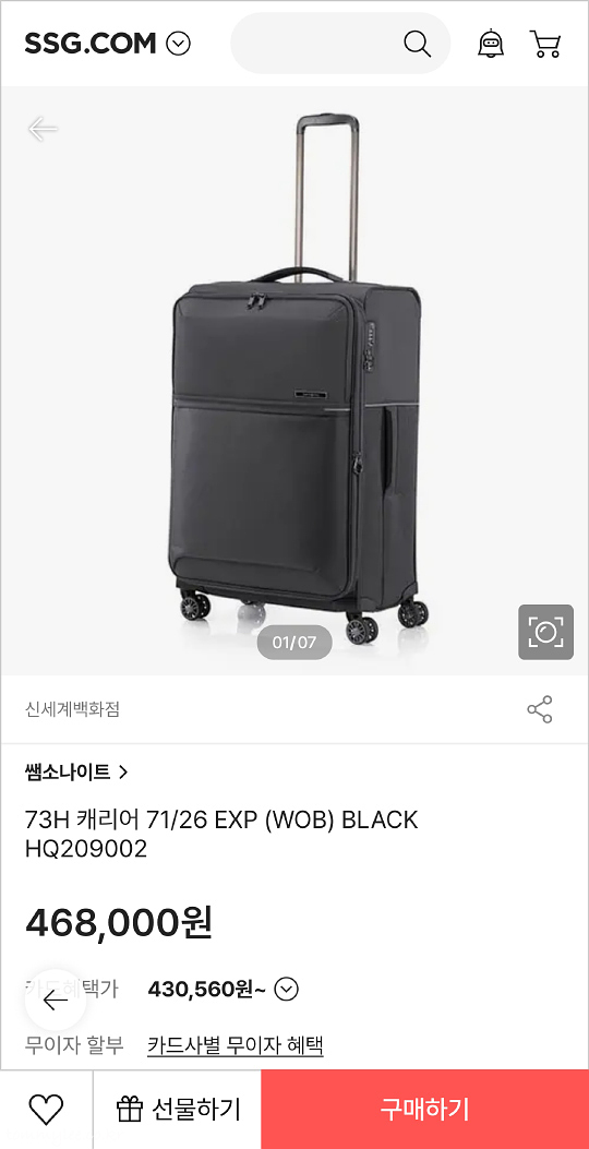 제가 원하는 제품이 만다리나덕에는 없었고요.. 쌤소나이트에 있었습니다.. 73H 캐리어 확장형 26인치 중형 블랙.. 이 제품으로 구입했어요.. 만다리나덕 에어크루보다 디자인은 다소 떨어지긴 했지만 무게가 무려 2.55Kg이라 그냥 다 필요없고 이게 저에겐 딱이었음.. ㅋㅋㅋ..