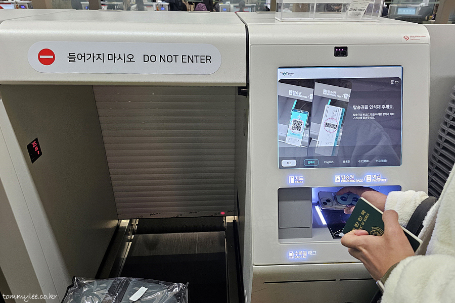 분명 성수기인데 티웨이는 줄이 길지 않았어요.. 거의 바로 셀프 백드랍 서비스를 이용할 수 있었답니다.. 지인분께서 셀프 백드랍 하는 거 촬영만 함.. 가장 먼저 해야 할 것은 탑승권 스캔입니다.. QR코드가 나와 있는 모바일 탑승권을 대주시면 됩니다..
