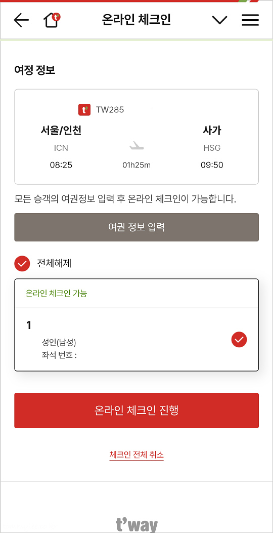 일본 큐슈 사가로 출발하기에 앞서 티웨이항공 모바일 체크인을 했답니다.. 지인분께서 남들보다 앞자리에 앉아 빨리 입국심사를 받는 걸 중요시 여기셔서, 빠른 모바일 체크인은 필수였어요..