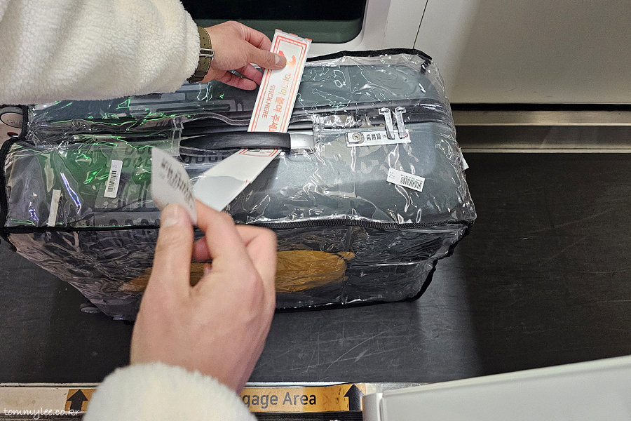 지인분께서 능숙한 손놀림으로 수하물 태그를 부착 중인 모습입니다..
