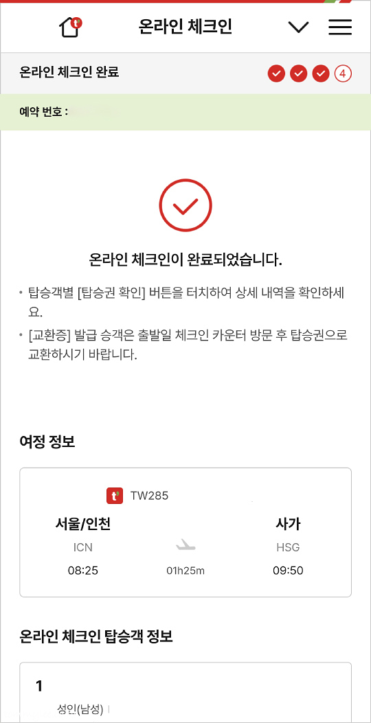 좌석 선택 후에는 모든 온라인 체크인 단계가 완료됩니다.. 여정 정보와 탑승객 정보 확인해 주시고요..