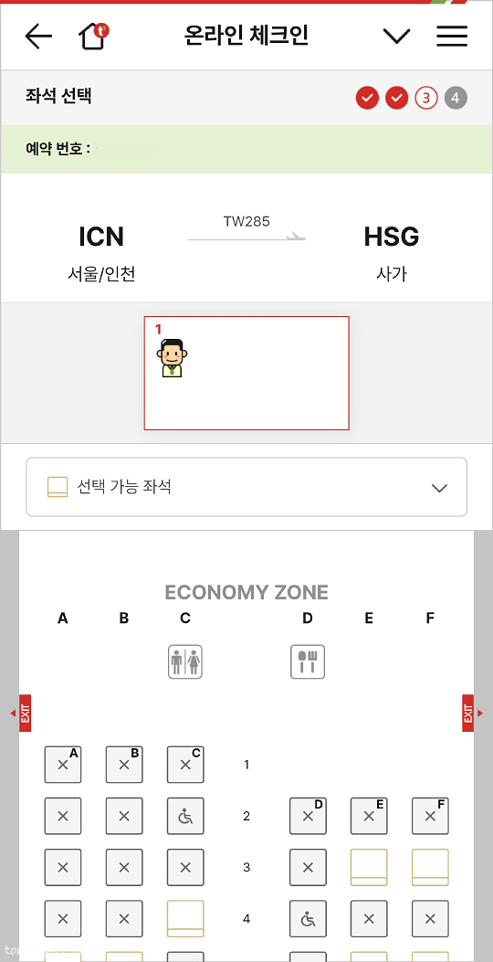 3번째 단계가 온라인 체크인에서 가장 중요한 좌석 선택의 시간.. 의외로 앞쪽 좌석이 많이 비어 있어서 선점할 수 있었습니다.. 5번까진 유료가 아닌가 했는데 아니네요.. 티웨이 좋네요..