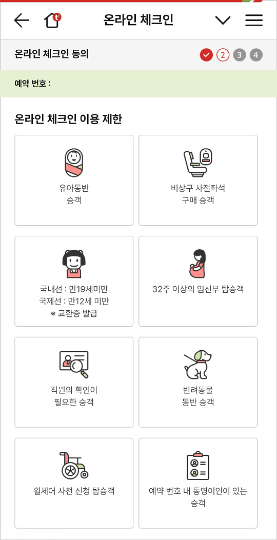 온라인 체크인 이용 제한.. 유아동반 승객, 비상구 사전좌석 구매 승객, 국제서 만 12세 미만, 32주 이상의 임신부 탑승객, 직원 확인이 필요한 승객, 반려동물 동반 승객, 휠체어 사전 신청 탑승객, 예약번호 내 동명이인이 있는 승객.. 확인해주시고요..